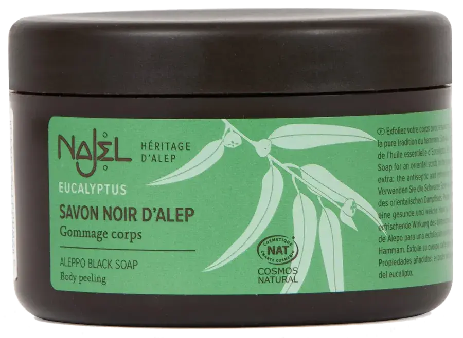 Pranašumas: priemonė yra antiseptinė ir natūraliai gaivinančio aromato, kurio pagrindas – eterinis rutulinių eukaliptų aliejus. „Najel“ siūlo juodojo muilo galią derinti su valomojo atsipalaidavimo akimirka. Šiuo visapusiškai puoselėjančiu produktu šveiskite kūno odą kartą per savaitę ir mėgaukitės švelnia bei puikia oda. Juodasis muilas naudojamas su juoda pirštine, energingai masažuojant odą sukamaisiais judesiais, arba su plaušinės pirštine, kuri kartu su muilu turi eksfolijuojamojo masažo poveikį.